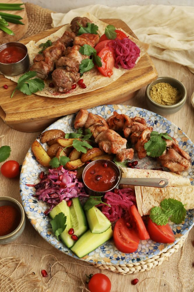 Шашлык куриный, томаты, свежие огурцы, лук маринованный, салат коул-слоу, лаваш, молодой картофель, соус сацебели.