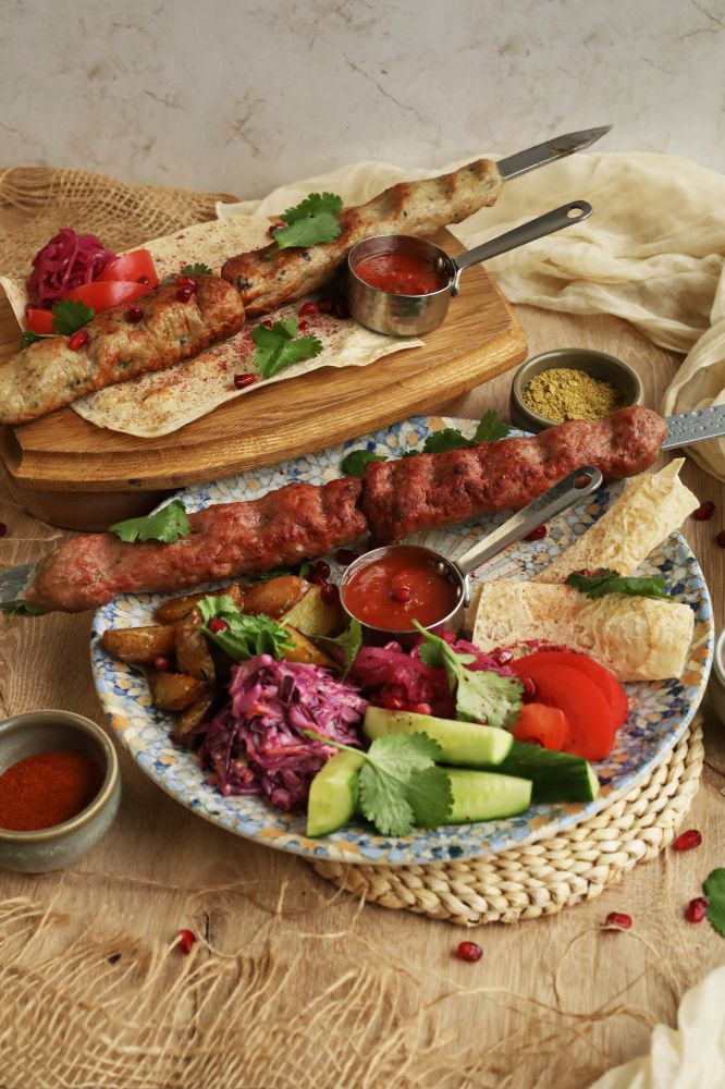 Люля свинина-говядина, томаты, свежие огурцы, лук маринованный, салат коул-слоу, лаваш, молодой картофель, соус сацебели.