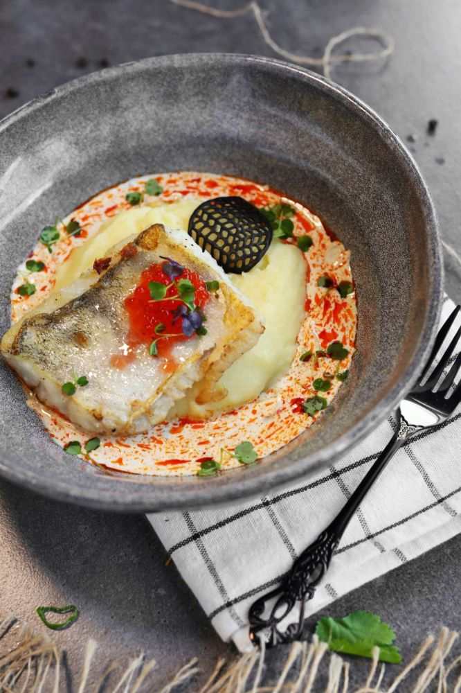 Филе судака, картофельное пюре, сливки, сметанно-чесночный соус, грузинские специи.