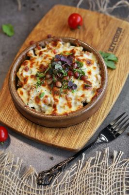 Шампиньоны, куриное бедро, лук, картофельные ломтики, ароматные грузинские специи, кинза, натуральные грузинские сыры.