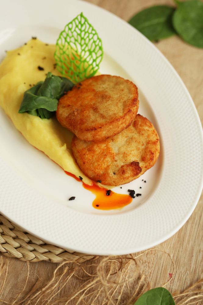 Котлеты из щуки, картофельное пюре, шпинат, красное масло.