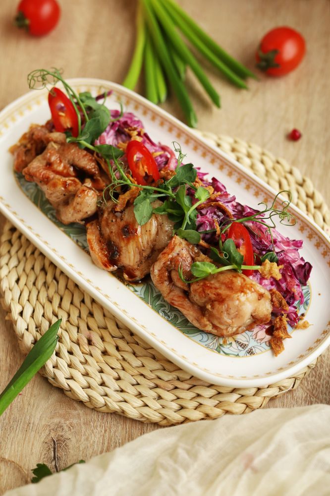 Куриное бедро, салат коул-слоу (капуста красная и белая, морковь, майонез), лук жареный, соус унаги.