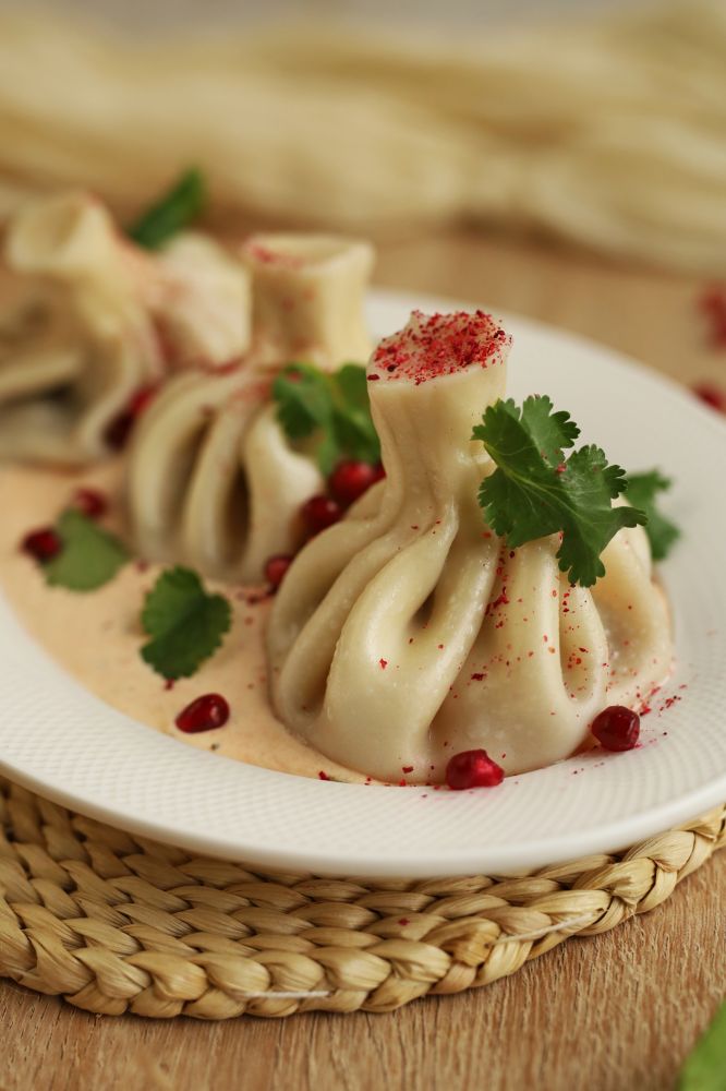 Хинкали свинина-говядина, розовый соус (на основе майонеза, сливок, томатов), зелень, кинза, гранат.