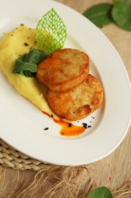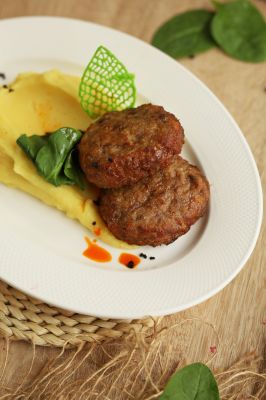 Котлеты из говядины и курицы, картофельное пюре, шпинат, красное масло.