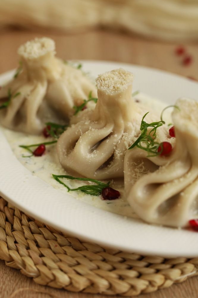 Хинкали с картошкой, соус сметано-чесночный, пармезан, лук зеленый.