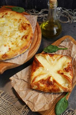 Круглый пирог с начинкой из двух грузинских сыров: сулугуни и имеретинский.
