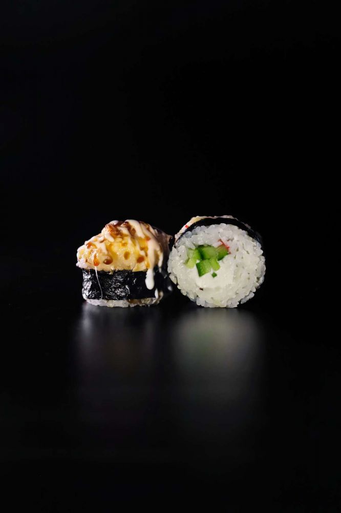 Запечённый ролл со свежим огурцом и сливочным сыром. Под нежнейшей сырной шапкой с лососем. Поливается соусом спайси или сливочным соусом на выбор.