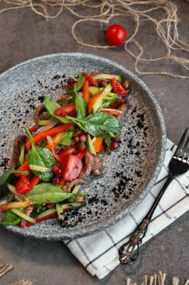 Говядина, болгарский перец, свежие огурцы, шпинат в ароматной грузинской и тайской заправке. Украшается гранатом.