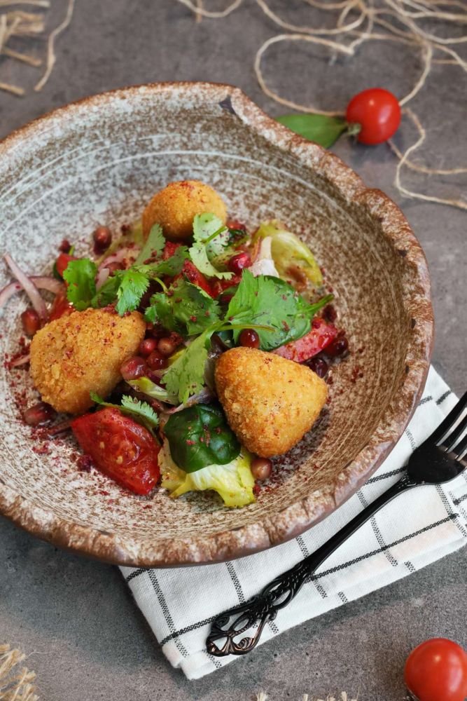 Жареные баклажаны в хрустящей панировке в сочетании с красным луком, томатами и свежей кинзой, в соусе на основе сладкого чили. Подается с нежным муссом из сыра Фета и сливочного сыра, и сочными зернами граната.
